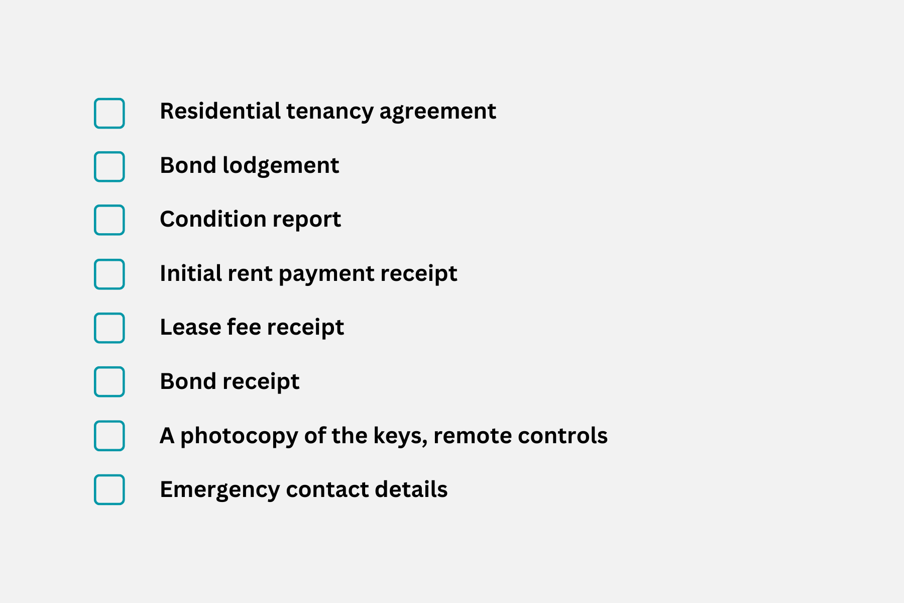 Use this checklist to ensure you are provided with copies of all of the necessary documents pertaining to your rental agreement.
