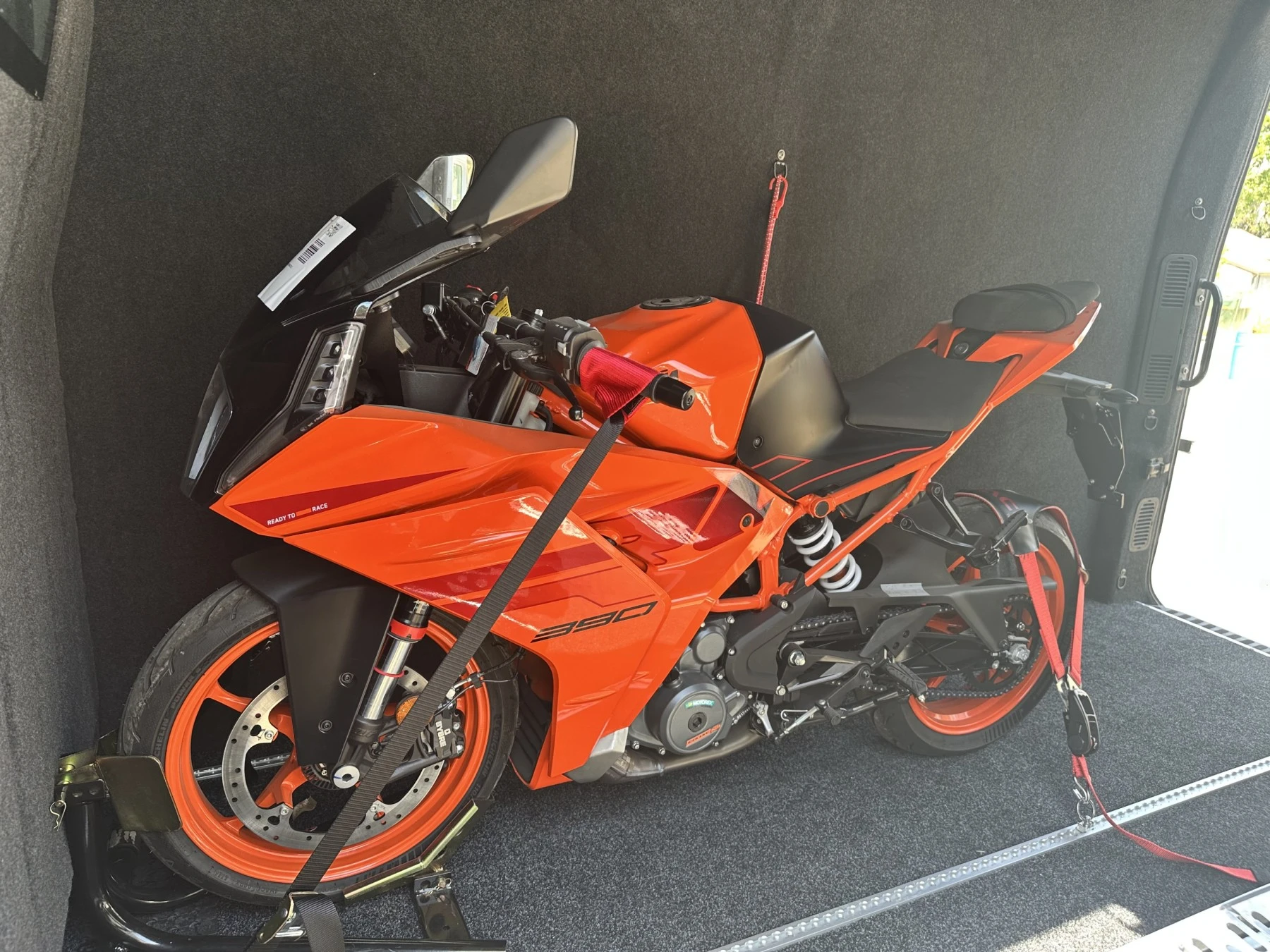 Front wheel chock to secure bike and strapping front and rear of bike.