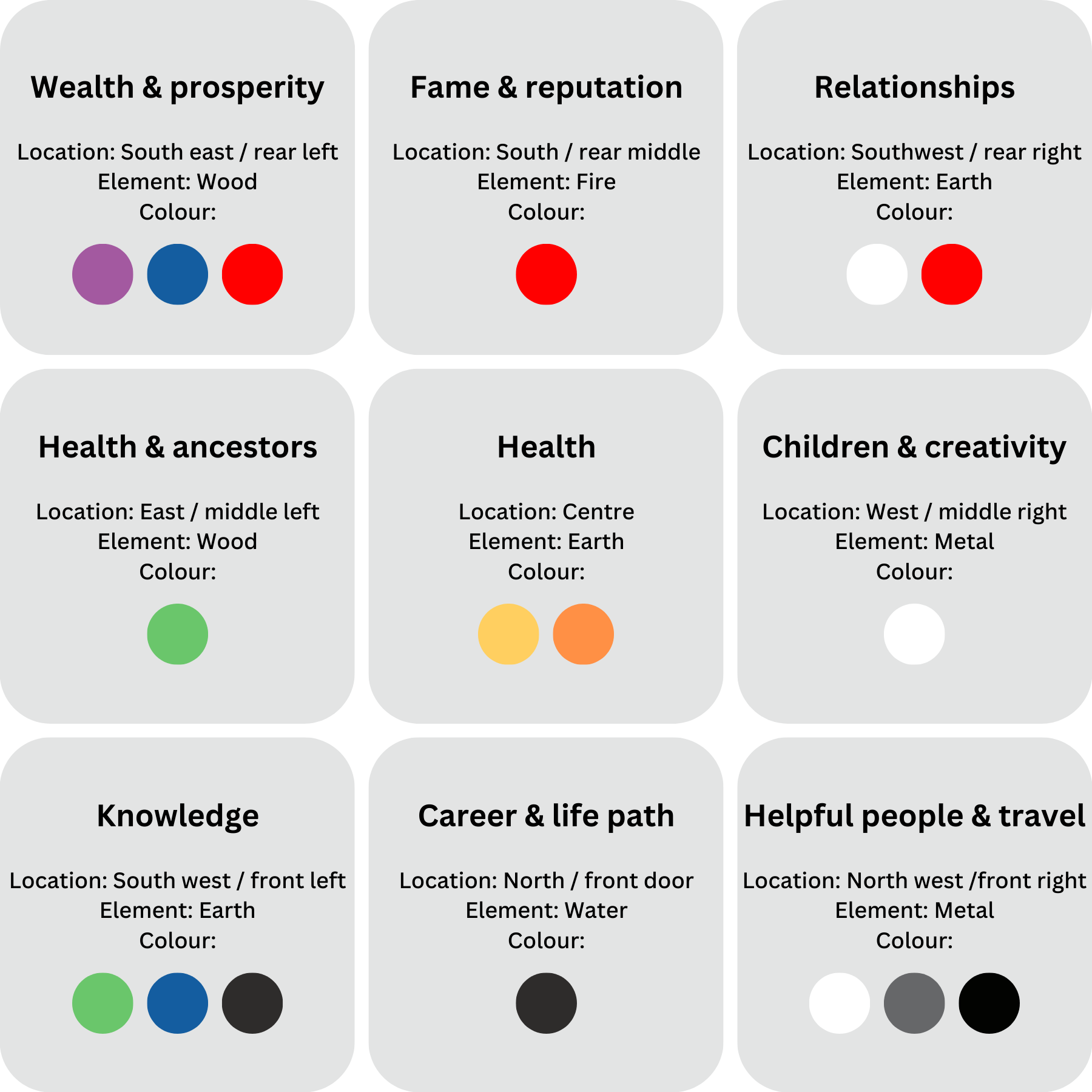 In feng shui the Bagua Map divides any space into nine areas - each with its own focus and colour.