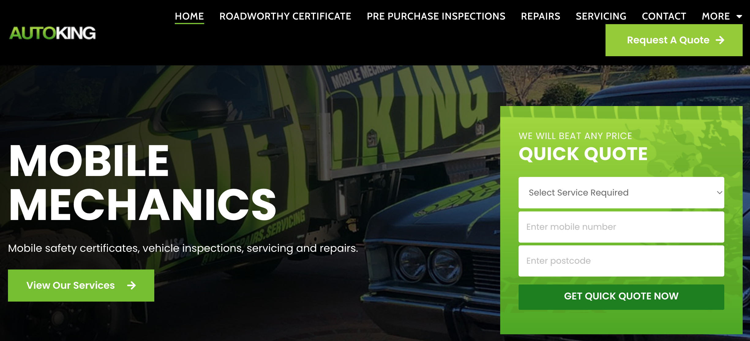 Auto King Mobile Mechanics offers a comprehensive range of mobile automotive services in Brisbane, Gold Coast, and Sunshine Coast. They specialize in providing mobile roadworthy certificates, safety certificates, pre-purchase vehicle inspections, as well as mobile car servicing and repair. Their services ensure client safety and convenience, as they perform inspections and repairs at the client's location. Additionally, they offer competitive pricing, promising to beat dealership prices for maintenance and log book servicing by at least 10%.