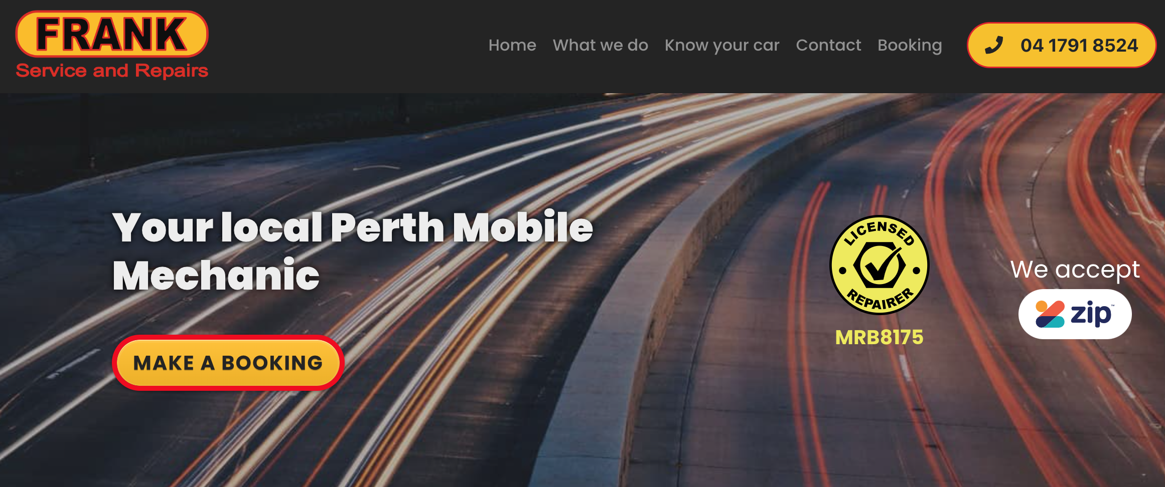 Frank Service and Repairs is a mobile mechanic service based in Perth, offering a range of car maintenance services. They specialize in logbook servicing for all vehicle makes and models, brake and clutch system repairs, auto-electrical solutions, timing belt and chain maintenance, and automatic transmission services. They emphasize providing insured and guaranteed workmanship with competitive pricing and the convenience of coming to the client's location, aiming for honest and genuine service experiences.