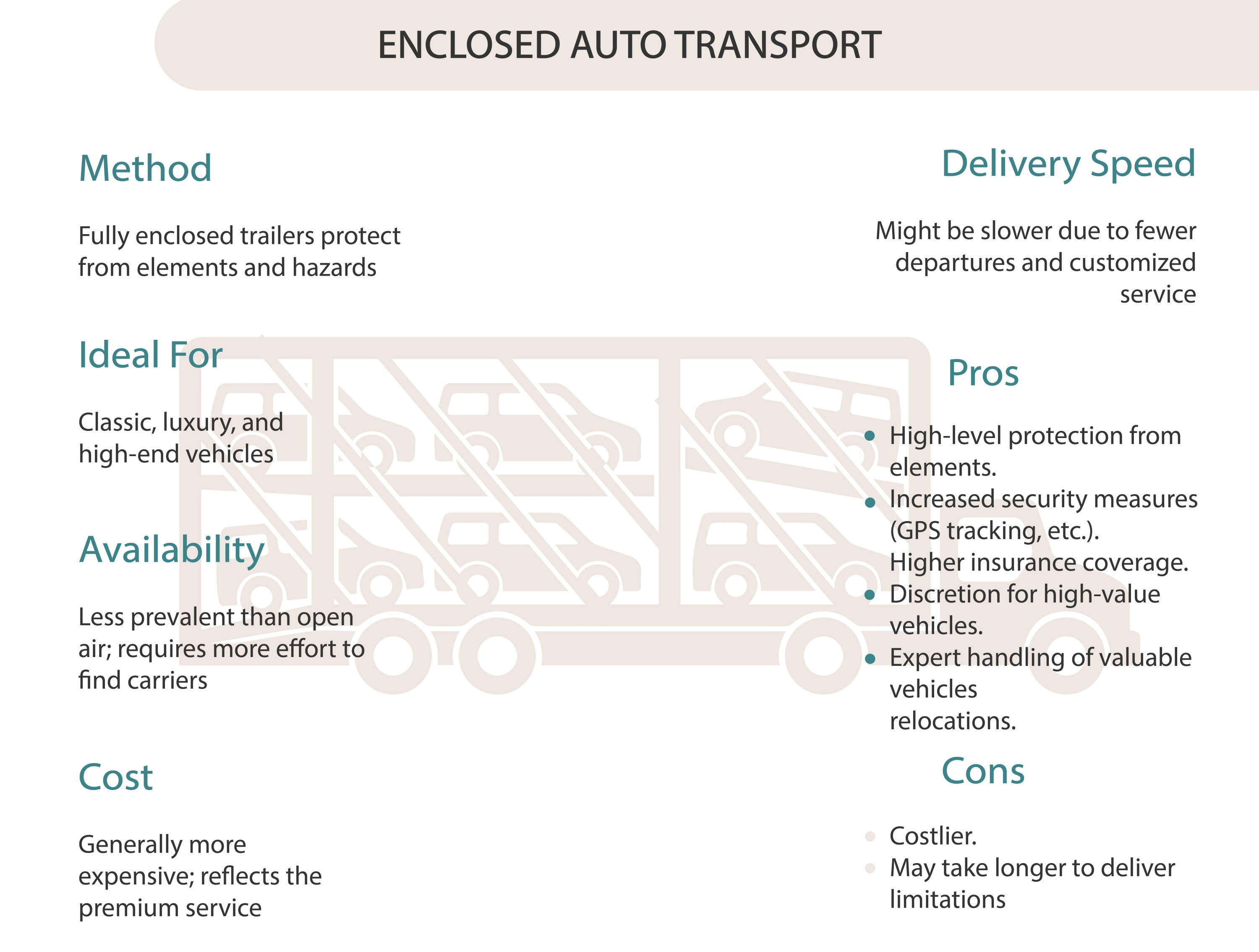 On the other hand, enclosed auto transport provides a higher level of security and protection for your vehicles during transportation. This option is ideal for classic cars or high-end vehicles that require extra care. However, it's important to consider that enclosed trailer services may be up to 40% more expensive and take longer to deliver.